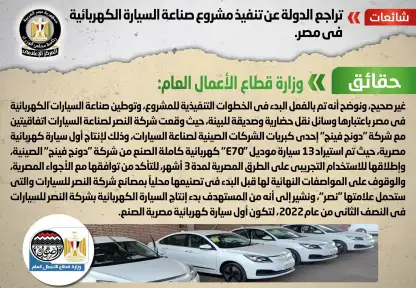 الحكومة تنفى التراجع عن تنفيذ مشروع صناعة السيارة الكهربائية في مصر